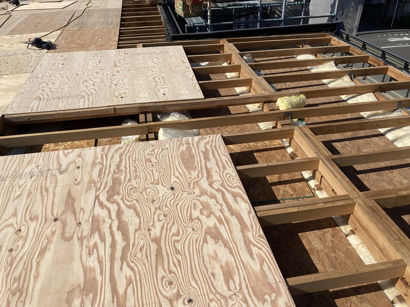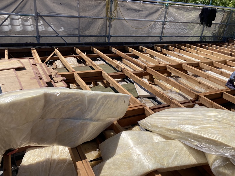 屋根をめくった後、合板下地と断熱材を新しいものに交換します。