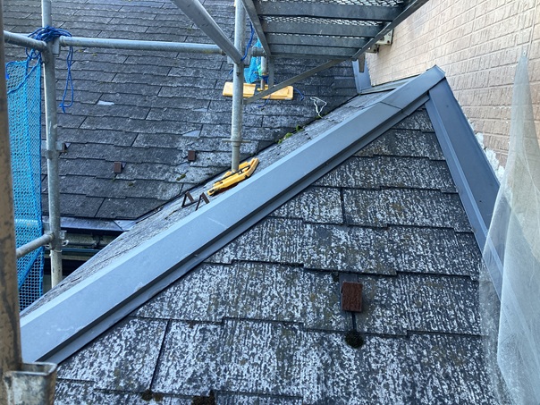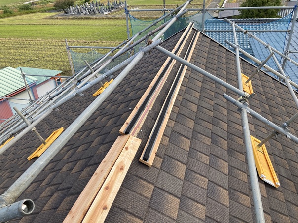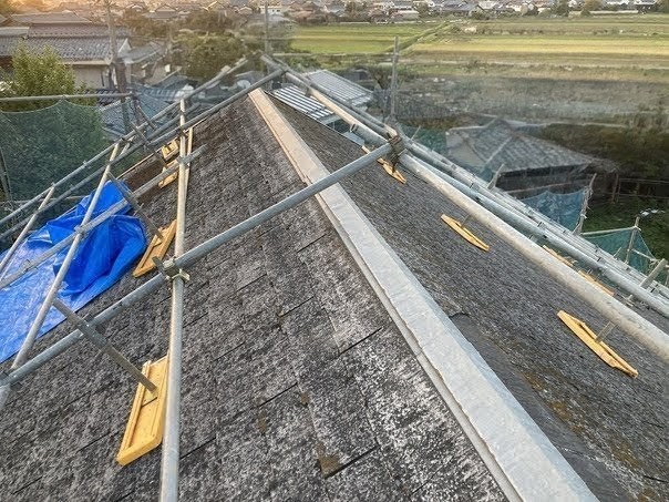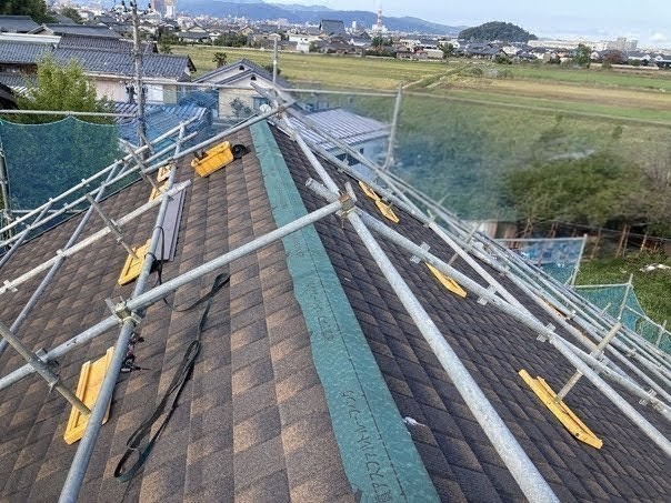 屋根は5寸勾配越えと、勾配が強いため屋根足場を組んでもらいました。