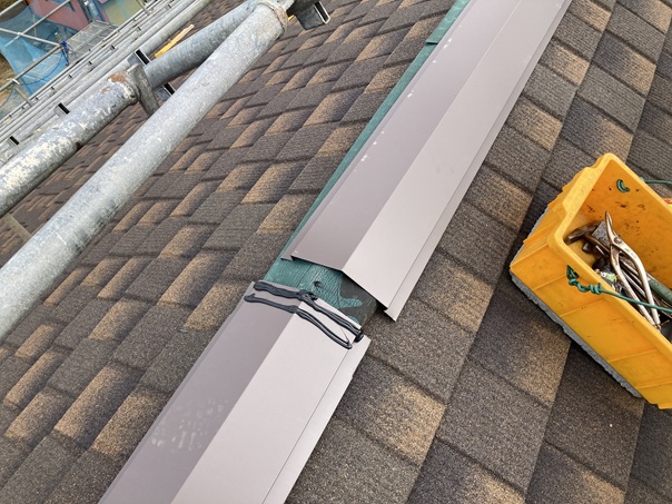 吹き込み防止のEPDMシーラーを間に挟み、ビスで棟下地材を固定。